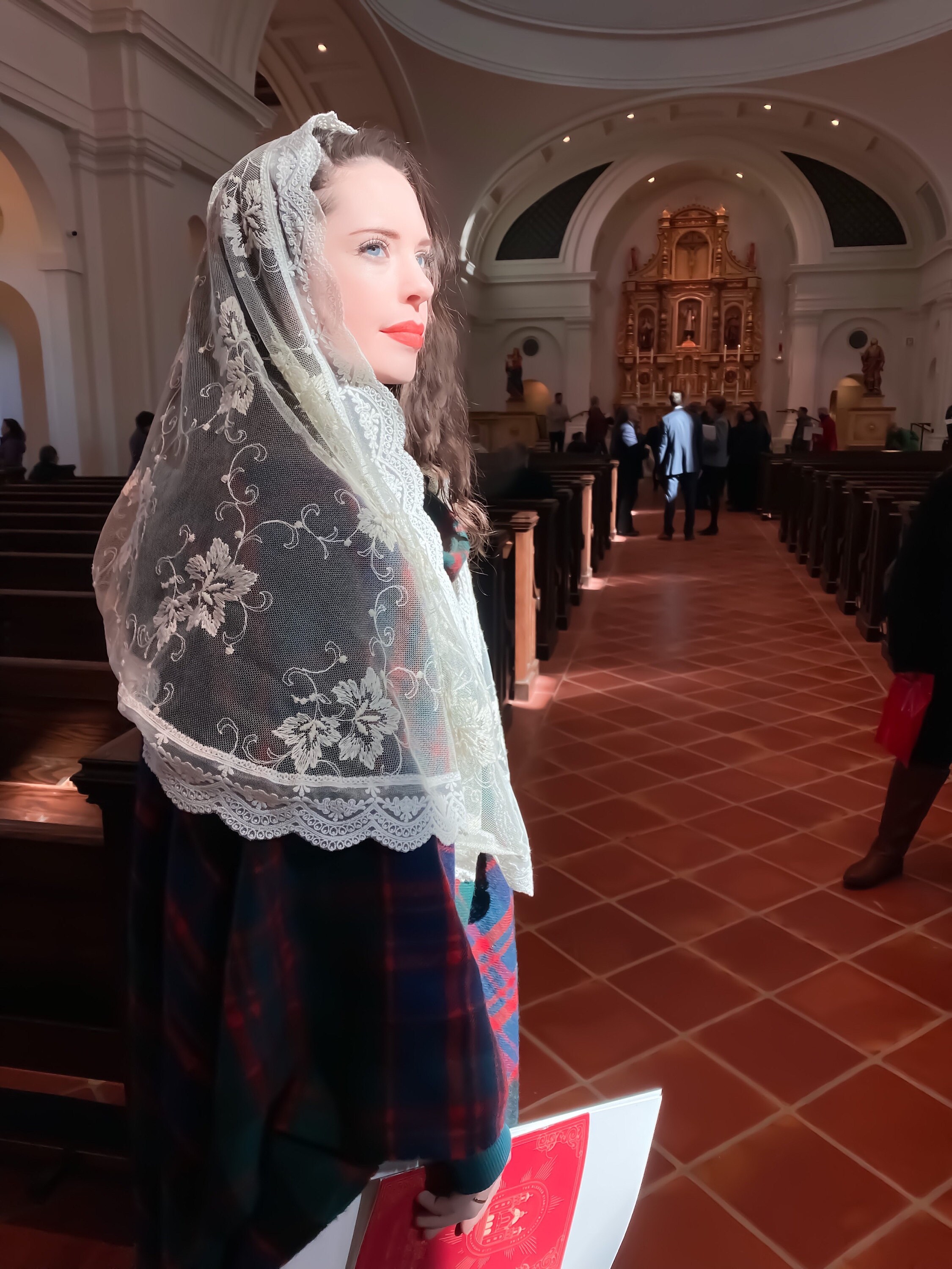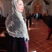 This is SOFT! In lovely and soft ivory vintage lace that was made in France, trimmed in elegant scalloped trim , this long, rounded rectangular chapel veil may also be used as a shawl, scarf, or wrap before or after Mass. It measures a generous 60 x 23 inches . Includes free sewn in clip, and mesh drawstring veil bag.